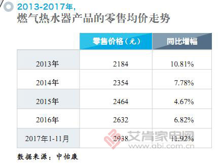 國內(nèi)外品牌紛紛加碼高端市場的新攻勢,直接帶動(dòng)了燃?xì)鉄崴鳟a(chǎn)品整體均價(jià)的大幅上揚(yáng)。據(jù)中怡康數(shù)據(jù)顯示,2017年1-11月份,燃?xì)鉄崴鞯牧闶劬鶅r(jià)上漲了11.92個(gè)百分點(diǎn)至2938元。盡管考慮到中怡康的監(jiān)測樣本以連鎖賣場為主,價(jià)格系數(shù)會(huì)相應(yīng)偏高,但如此大的漲幅印證了燃?xì)鉄崴髡诩铀佼a(chǎn)品結(jié)構(gòu)的調(diào)整和升級(jí)。據(jù)《艾肯家電》統(tǒng)計(jì),2017年,我國燃?xì)鉄崴鳟a(chǎn)品的整體均價(jià)大致維持在2055元左右,同比漲幅約6.15%。
