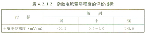 2直流干擾程度評(píng)價(jià)指標(biāo)應(yīng)符合表4.2.1-1的規(guī)定;當(dāng)管地電位正向偏移值難以測(cè)取時(shí),可采用土壤電位梯度指標(biāo)評(píng)價(jià),雜散電流強(qiáng)弱程度的評(píng)價(jià)指標(biāo)應(yīng)符合表4.2.1-2的規(guī)定;
