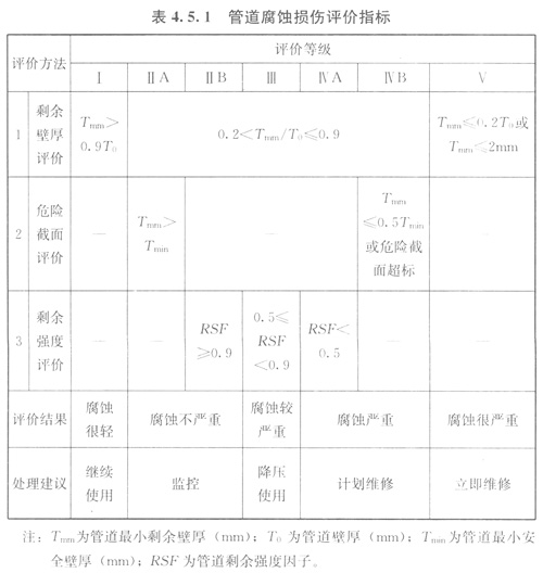 4.5.1管道腐蝕損傷評價(jià)的方法應(yīng)符合現(xiàn)行行業(yè)標(biāo)準(zhǔn)《鋼制管道及儲(chǔ)罐腐蝕評價(jià)標(biāo)準(zhǔn)埋地鋼質(zhì)管道外腐蝕直接評價(jià)》SY/T0087.1的有關(guān)規(guī)定。當(dāng)采用剩余壁厚、危險(xiǎn)截面和剩余強(qiáng)度三個(gè)層次逐級評價(jià)時(shí),管道腐蝕損傷評價(jià)指標(biāo)應(yīng)符合表4.5.1的規(guī)定。