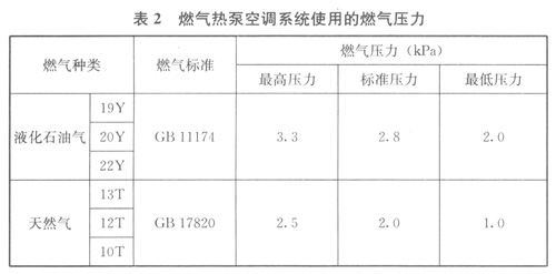 2.2.5現(xiàn)行國家標(biāo)準(zhǔn)《燃?xì)獍l(fā)動(dòng)機(jī)驅(qū)動(dòng)空調(diào)(熱泵)機(jī)組》GB/T 22069—2008中第6.1.2條規(guī)定了燃?xì)鉄岜每照{(diào)機(jī)組使用的燃?xì)鈮毫θ绫?/span>2所示。