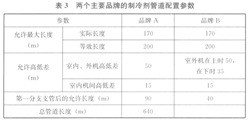 室內(nèi)、外機(jī)之間以及室內(nèi)機(jī)之間的最大管長與最大高差,是燃?xì)鉄岜每照{(diào)系統(tǒng)的重要性能參數(shù),為保證系統(tǒng)運(yùn)行安全、穩(wěn)定、高效,在設(shè)計(jì)時(shí),系統(tǒng)的最大管長與最大高差不應(yīng)超過所選用產(chǎn)品的技術(shù)要求。表3列出了兩個(gè)主要品牌的相關(guān)技術(shù)要求。