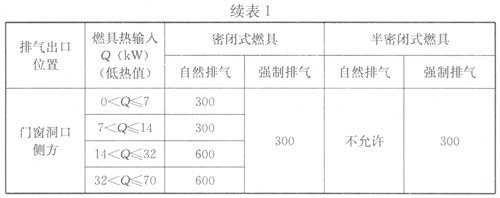 2我國住宅多數(shù)為多層或高層,多數(shù)燃具煙管高位安裝在本層門窗洞口上方,即安裝在上層住宅門窗洞口的下面了,故對上一層住宅的門窗洞口會有煙氣進(jìn)入的問題產(chǎn)生。對居住房間(臥室和起居室)參照英、美標(biāo)準(zhǔn)進(jìn)行了嚴(yán)格的安全間距規(guī)定(1.2~1.5)m,這與英、美單層住宅不同。
