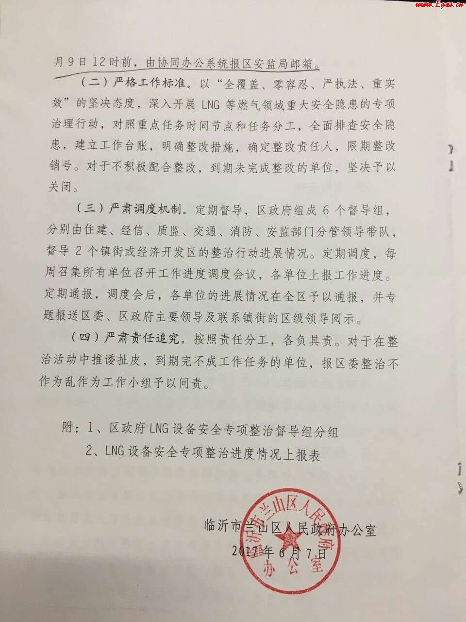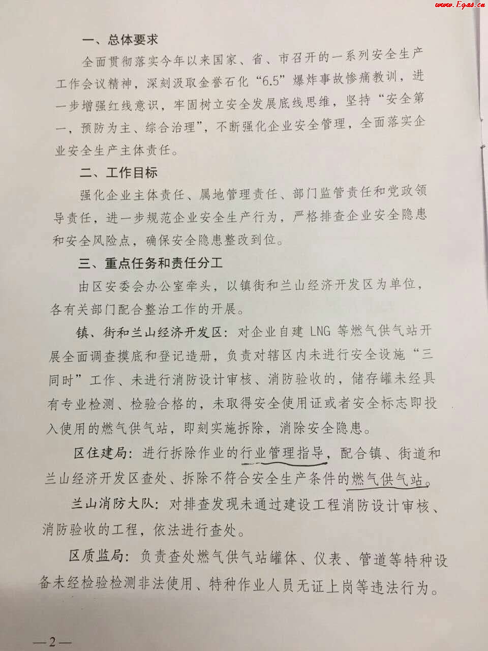臨沂市蘭山區(qū)人民政府下發(fā)了關(guān)于開(kāi)展企業(yè)自用LNG設(shè)備等燃?xì)獍踩珜m?xiàng)整治行動(dòng)的通知。通知明確了鎮(zhèn)、街和蘭山經(jīng)濟(jì)開(kāi)發(fā)區(qū)、區(qū)住建局、蘭山消防大隊(duì)、區(qū)質(zhì)監(jiān)局、區(qū)安監(jiān)局、蘭山交通分局以及區(qū)經(jīng)信局等各部門的主要任務(wù)和責(zé)任分工,其中區(qū)住建局進(jìn)行拆除作業(yè)的行業(yè)管理指導(dǎo),而鎮(zhèn)、街道和蘭山經(jīng)濟(jì)開(kāi)發(fā)區(qū)具體執(zhí)行拆除作業(yè)。此外,通知還明確了專項(xiàng)整治行動(dòng)的各個(gè)時(shí)間節(jié)點(diǎn),企業(yè)自行拆除和各屬地單位集中拆除的時(shí)間節(jié)點(diǎn)需要注意。