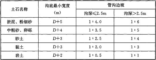 1 河底管溝的溝底寬度和邊坡尺寸應根據(jù)土石性質(zhì)、水流速度、開挖深度和施工方法等因素確定,必要時可進行試挖。當無試驗條件和數(shù)據(jù)時,開挖管溝尺寸可分別按表5.2.4-1和表5.2.4-2確定。