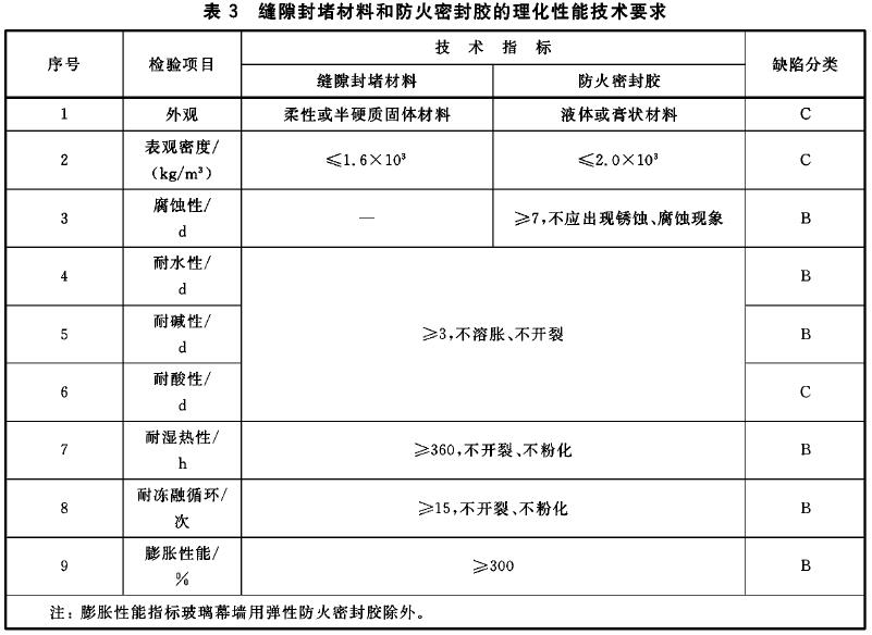 5.3.2 縫隙封堵材料和防火密封膠的理化性能應(yīng)符合表3的規(guī)定。