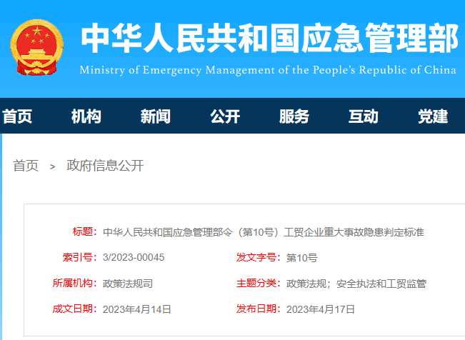 《工貿(mào)企業(yè)重大事故隱患判定標準》已經(jīng)2023年3月20日應(yīng)急管理部第7次部務(wù)會議審議通過,現(xiàn)予公布,自2023年5月15日起施行。