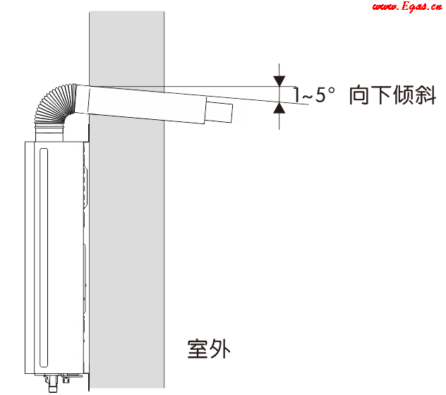 • ⑤ 排煙管應(yīng)有朝外向下1~5°的角度,以利于冷凝水流出;通過可燃?jí)Ρ跁r(shí),應(yīng)有≥20mm厚度絕緣材料分隔及覆蓋;