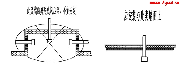 • ③ 排煙口不得安裝在樓房的換氣風(fēng)道或公共煙道上;排煙孔位置應(yīng)避開墻面易形成正壓區(qū)的凹形區(qū)。