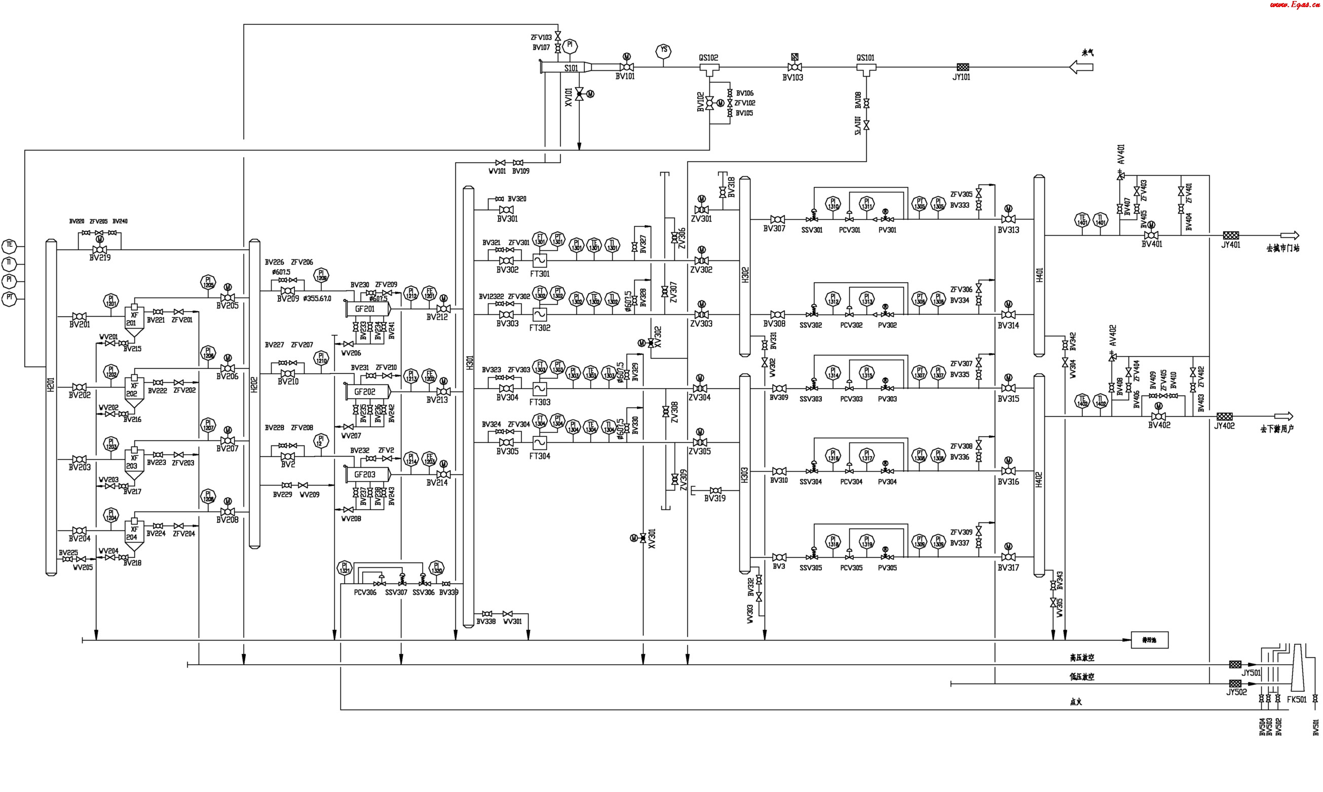 在分輸管道上設(shè)有超高壓安全泄放設(shè)備,當(dāng)分輸出口的壓力高于設(shè)定值時(shí),將自動(dòng)泄壓。高、低壓天然氣分別經(jīng)放空匯管至放空火炬。