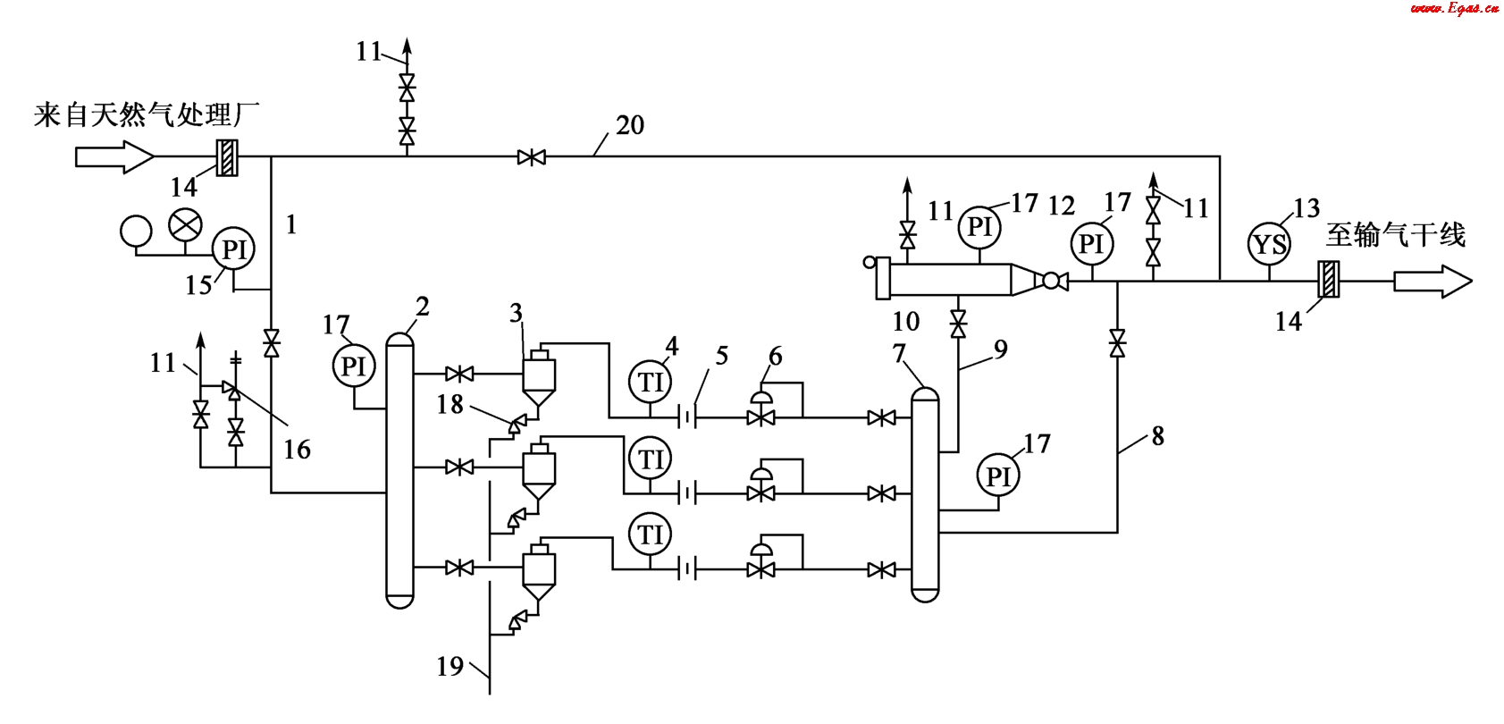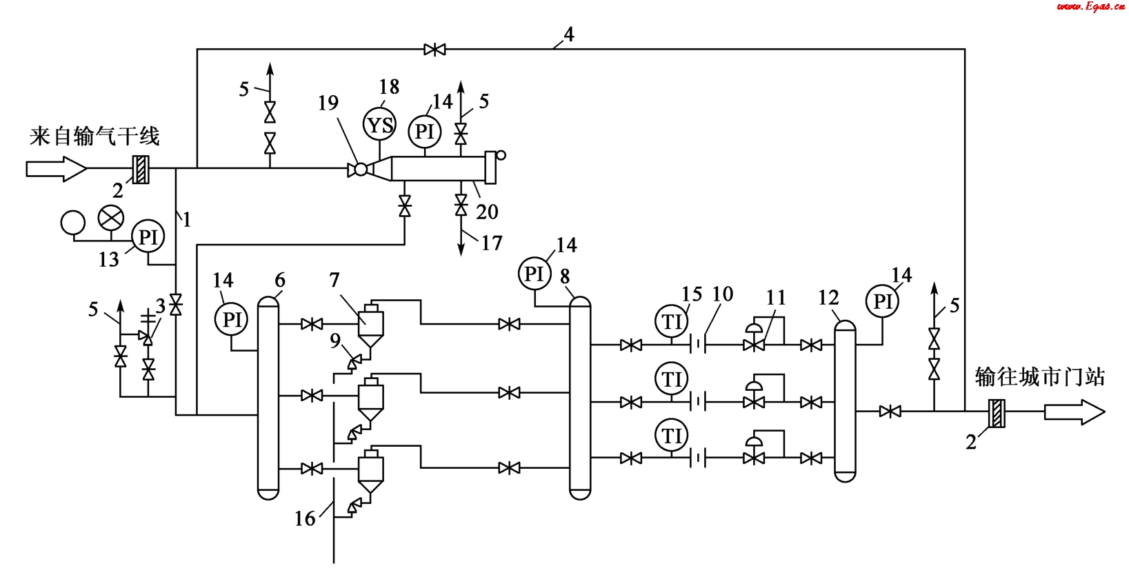 1—進(jìn)氣管;2,7—匯管;3—多管除塵器;4—溫度計(jì);5—流量計(jì);6—調(diào)壓閥;8—外輸氣管線;9—清管用旁通管;10—清管器發(fā)送裝置;11—放空管;12—球閥;13—清管器通過指示器;14—絕緣法蘭;15—電接點(diǎn)壓力表(帶聲光信號(hào));16—安全閥;17—壓力表;18—節(jié)流閥;19—排污管;20—越站旁通管