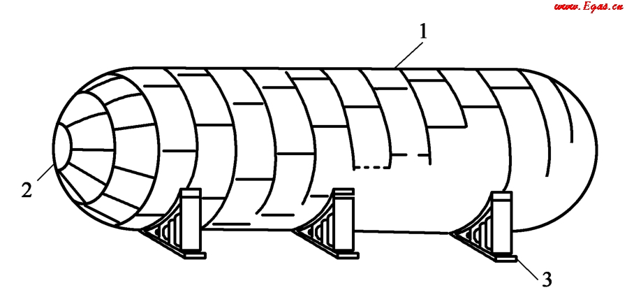 在高壓氣罐中燃?xì)獾膬Υ嬖砼c前述低壓氣罐有所不同,即其幾何容積固定不變,而是靠改變其中燃?xì)獾膲毫砀淖兤鋬饬康?,因此稱定容儲罐。由于定容儲罐沒有活動部分,因此結(jié)構(gòu)比較簡單。