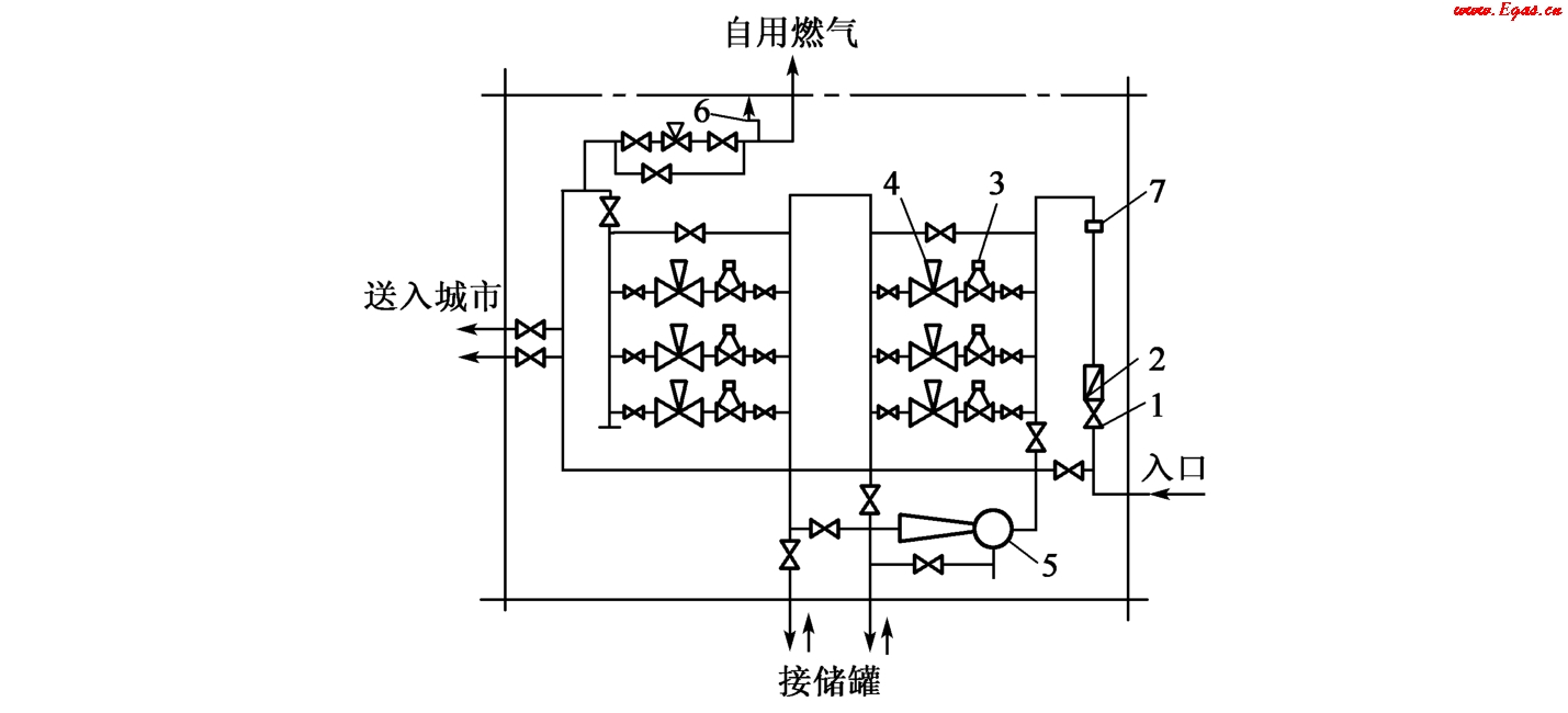 如果長距離輸氣管線的壓力大于儲氣庫的壓力,必要時使天然氣通過預(yù)熱器再進(jìn)入儲氣庫,以防止在壓力突然降低時生成水合物。如果儲氣庫的壓力大于或等于管線壓力,則必須使天然氣經(jīng)壓縮機(jī)加壓,達(dá)到需要的壓力后送入儲氣庫,而儲氣庫則靠自身的壓力將天然氣輸出。輸出的天然氣在進(jìn)調(diào)壓器前也需經(jīng)過預(yù)熱器。此外,在儲氣庫工作的第一年,還需要將含水的天然氣進(jìn)行干燥處理。
