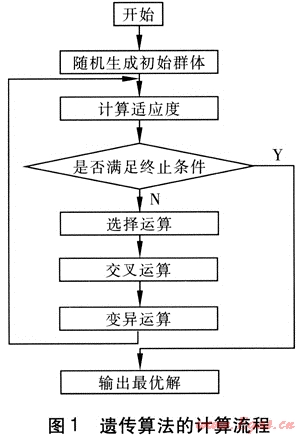 遺傳算法作為一種全局優(yōu)化搜索方法,以其簡單通用、魯棒性強、適于并行處理以及應用范圍廣等特點,在求解復雜的工程優(yōu)化問題中取得了良好的效果。它是基于生物進化的思想,將優(yōu)化計算中的迭代過程模擬成物種進化的過程,形成一種具有“生成+檢驗”特征的搜索算法[5]。它以編碼空間代替問題的參數(shù)空間,以適應度函數(shù)為評價依據(jù),以編碼群體為進化基礎,以對群體中個體位串的遺傳操作實現(xiàn)選擇和遺傳機制,建立起一個迭代過程,使遺傳算法具有了其他傳統(tǒng)優(yōu)化方法所沒有的特性。遺傳算法的計算流程見圖1。