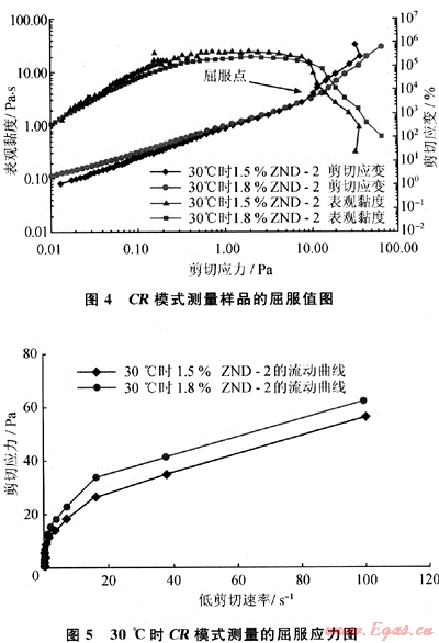 CS模式下(圖3),剪切應(yīng)變(γ)-剪切應(yīng)力(τ)雙對數(shù)坐標(biāo)拐點(diǎn)求得的1.5%凝膠ZND-2在30℃和50℃時的屈服值分別為5.992Pa、6.977Pa。采用CS模式測量時,在低剪切應(yīng)力下,凝膠表現(xiàn)出一個明顯黏度(表觀黏度η)平臺,當(dāng)施加的應(yīng)力接近屈服值時,黏度下降加快,一般認(rèn)為,在對數(shù)坐標(biāo)下黏度曲線的陡然下降(-40°~-45°)時,認(rèn)為此時黏度所對應(yīng)的剪切應(yīng)力為屈服應(yīng)力,應(yīng)變曲線拐點(diǎn)與黏度曲線陡降段具有一致性,但在很低剪切速率下測量高黏高彈性的凝膠材料時測的黏度數(shù)據(jù)不穩(wěn)定,易產(chǎn)生波動[8]。