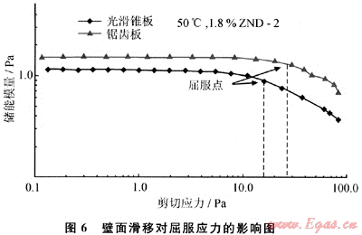考慮了壁面光滑程度對屈服值的影響,采用了鋸齒狀平板轉(zhuǎn)子測量凝膠的屈服值(見圖6),光滑錐板和鋸齒狀板線性黏彈區(qū)與非線性黏彈區(qū)交點(diǎn)對應(yīng)的1.8%凝膠ZND2的屈服值為16.77Pa和24.56Pa,屈服值差為46.5%。而鋸齒狀平板轉(zhuǎn)子選用CS模式和CR模式在低應(yīng)力和低剪切速率范圍內(nèi)得到的數(shù)值波動到劇烈,數(shù)值不穩(wěn)定[10]。