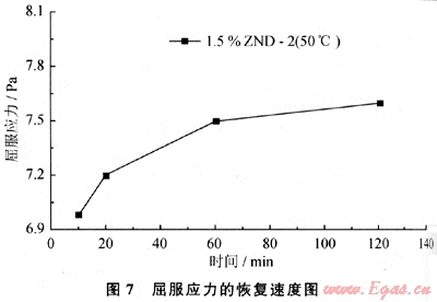 實(shí)驗(yàn)考察了凝膠結(jié)構(gòu)回復(fù)與時間的關(guān)系,凝膠的屈服應(yīng)力(τy)與時間(t)的關(guān)系,如圖7所示,在較短的時間內(nèi),凝膠的切力可以很快的恢復(fù)到一個較高的值,隨著時間的延長逐漸增加到最大值。凝膠的結(jié)構(gòu)恢復(fù)快,有利于堵漏。