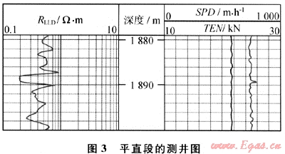圖3為資料中感應(yīng)電阻率曲線(RILD)及同次測井帶測的張力曲線(TEN)、速度曲線(SPD)。軟件利用曲線擬合法檢查出1888.11~1889.21m為平直段(幅度值均為0.2Ω·m,該段相對均方差為0),同時張力曲線和速度曲線在相應(yīng)的深度段沒有明顯異常,說明并不是因?yàn)閮x器遇卡現(xiàn)象引起的平直段.因此軟件判斷1888.11~1889.21m為平直異常。