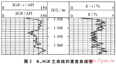 圖2為資料中深度校正后的總自然伽馬(SGR)、鉀含量(K)曲線的主曲線和重復(fù)曲線圖,石油天然氣行業(yè)標(biāo)準(zhǔn)SY/T 5132—2003《測井原始資料質(zhì)量要求》中對自然伽馬能譜測井重復(fù)性的要求為:重復(fù)曲線與主曲線形狀基本相同,總自然伽馬重復(fù)測量值相對誤差應(yīng)小于5%,鉀的重復(fù)測量值相對誤差應(yīng)小于10%。結(jié)合企業(yè)生產(chǎn)實(shí)際,約定重復(fù)誤差符合標(biāo)準(zhǔn)的井段總長度不得少于45m(常規(guī)測井重復(fù)曲線至少測50m,50m時90%要符合標(biāo)準(zhǔn),即50×90%=45m)。軟件經(jīng)計算得:曲線SGR重復(fù)曲線與主曲線相關(guān)系數(shù)為0.983,曲線校深后,重復(fù)誤差符合標(biāo)準(zhǔn)的井段總長度為53.5m;曲線K重復(fù)曲線與主曲線相關(guān)系數(shù)為0.765,校深后,重復(fù)誤差符合標(biāo)準(zhǔn)的井段總長度為36.5m。因此,軟件得到重復(fù)性檢查結(jié)論:曲線SGR合格,曲線K不合格。