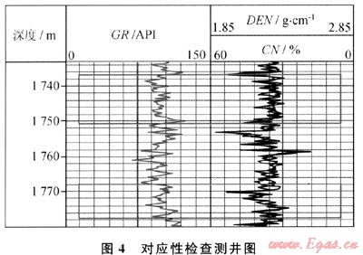 圖4是資料中伽馬曲線(GR)、密度曲線(DEN)、中子曲線(CN)。以GR曲線為基準(zhǔn)曲線劃分層段并挑選層段,1736.81~1750.61m和1768.01~1777.51m(圖中紅框標(biāo)示)是軟件挑選的兩個層段,在兩個層段DEN曲線和CN曲線的相關(guān)系數(shù)分別為-0.75和-0.74,與預(yù)先設(shè)置的規(guī)則(負(fù)相關(guān)、最小相關(guān)系數(shù)0.7,依據(jù)地區(qū)經(jīng)驗(yàn)設(shè)置)相比,軟件判斷DEN曲線和CN曲線的對應(yīng)性合格。