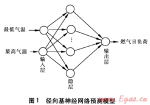 徑向基神經(jīng)網(wǎng)絡(luò)[2]是一種兩層前向型神經(jīng)網(wǎng)絡(luò),包含一個具有徑向基函數(shù)神經(jīng)元的隱層和一個具有線性神經(jīng)元的輸出層。在燃氣短期負荷預(yù)測領(lǐng)域中,它以訓練速度快、學習精度高的優(yōu)點開始逐漸嶄露頭角。考慮到燃氣日負荷受天氣狀況影響比較大,筆者以網(wǎng)絡(luò)的輸入為最低氣溫、最高氣溫,輸出為燃氣日負荷建立徑向基神經(jīng)網(wǎng)絡(luò)預(yù)測模型(見圖1)。