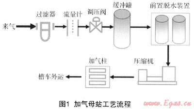 加氣母站一般建設(shè)在天然氣主管道附近,將主管道內(nèi)的氣體進(jìn)行壓縮至20MPa后儲存在轉(zhuǎn)運(yùn)車槽罐內(nèi),然后再運(yùn)到無氣源的子站供氣。它的主要特點(diǎn)是靠近主管網(wǎng),進(jìn)氣壓力穩(wěn)定且較高。加氣母站設(shè)備主要由氣體預(yù)處理系統(tǒng)(進(jìn)站計(jì)量裝置、調(diào)壓裝置、過濾裝置、深度脫水裝置等)、壓縮機(jī)組、售氣機(jī)等設(shè)備組成。其主要工藝流程如圖1所示。
