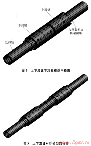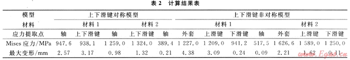 表2給出了兩種模型的主要結(jié)果數(shù)據(jù)。從表2中可以看出:對于上下滑鍵非對稱模型,其高應(yīng)力主要集中在上滑鍵與外套的連接處,軸上最大應(yīng)力只有389.4MPa,遠(yuǎn)沒有達(dá)到受剪軸的承載極限,而外套和上滑鍵的連接處其局部應(yīng)力均已超過材料的極限承載能力。也即是說,外套和上滑鍵已經(jīng)破壞,整個結(jié)構(gòu)已經(jīng)失效,而此時受剪軸還處于完全彈性狀態(tài),整個結(jié)構(gòu)的應(yīng)力和變形很不協(xié)調(diào);對于上下滑鍵對稱模型,由于材料選取的不同,導(dǎo)致兩種模型的應(yīng)力值差別較大,模型2的材料屈服應(yīng)力高,得到的應(yīng)力分布結(jié)果也較大;但是其應(yīng)力分布無明顯差別,中軸的受剪效果均很明顯。