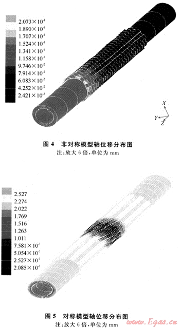 圖4和圖5給出了兩種模型軸向位移分布圖,從圖中可以看出:對稱結(jié)構(gòu)的中軸受剪效果明顯優(yōu)于非對稱結(jié)構(gòu),各部分位移分布也更合理,在隨鉆安全接頭的設(shè)計中宜用對稱結(jié)構(gòu)。