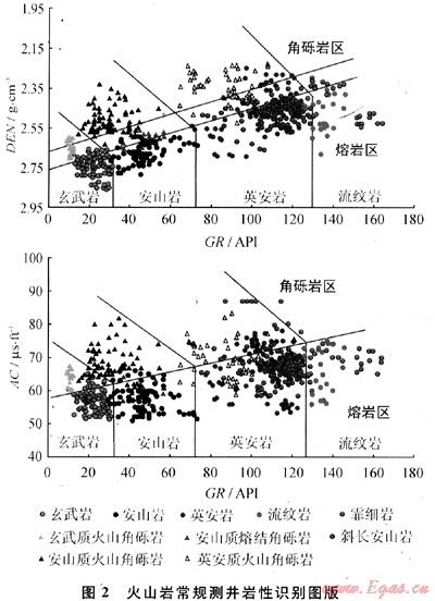 3) 通過巖心、薄片刻度測井建立火山巖常規(guī)測井巖性識別圖版?;鹕綆r巖性識別是建立火山巖巖相模式、識別火山巖體的基礎(chǔ),以巖心、薄片刻度測井建立火山巖常規(guī)測井巖性識別圖版,充分發(fā)揮了各自的作用?;?7口井631塊巖石薄片巖性分析數(shù)據(jù)建立的圖版如圖2所示,由圖2可知,從基性巖到酸性巖,GR變大、DEN減小、AC增大的特征清晰,規(guī)律明顯。