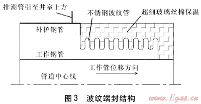 內(nèi)外管之間設(shè)波紋端封。為避免事故狀態(tài)下井室進水導(dǎo)致保溫層進水,需將內(nèi)外管之間封閉。但內(nèi)外管相對位移較大,封閉裝置采用不銹鋼波紋端封形式,波紋端封補償量按內(nèi)外管相對位移選取,經(jīng)計算波紋端封補償量為1050mm。這樣有效地解決了保溫層進水及內(nèi)外管相對位移的問題。波紋端封結(jié)構(gòu)見圖3。