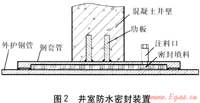 管道穿井室采用井室防水密封裝置,DN 600mm管道外管的外徑為1020mm,外管計算熱伸長為185mm,如果外管與井壁采用止水環(huán)剛性連接,限制外管的位移,則外管對井室的推力將達到6200kN。采用傳統(tǒng)的柔性密封方式可靠性較差。解決這一問題的方法有兩個:①外管加裝波紋管補償器,但又存在波紋管補償器長期浸于水中檢修、維護問題。②外管與井壁連接處采用防水性能較為可靠的井室防水密封裝置,此裝置結(jié)構(gòu)與套筒補償器結(jié)構(gòu)相似,確保了井室整體的防水性。經(jīng)研究,在此工程中采用了井室防水密封裝置,通過專用注料器把密封填料通過注料口壓進填料空腔,這樣在保證外管自由伸縮的同時也阻止水滲漏入井室。井室防水密封裝置見圖2。