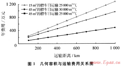若采購相同幾何容積的槽車來運輸LNG,可得幾何容積與運輸成本的關(guān)系(如圖1所示)。
