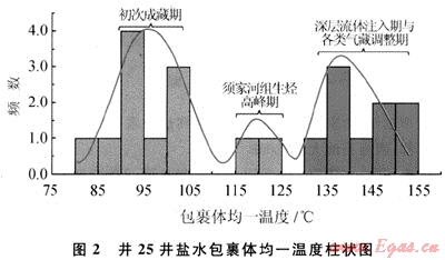 井25井須家河組儲層兩種鹽度值反映存在2種烴源產物,其中第一種較低鹽度(NaCl質量分數(shù)為6.6%~8.0%)對應較高的均一溫度范圍(115~150℃),應為演化程度較高的油氣所伴生;第二種較高的撲度(NaCl質量分數(shù)為21.8%~22.1%)和較低均一溫度范圍(82~102℃),是剛進入大量生烴階段的產物(表1)。統(tǒng)計井25井須家河組儲層與烴類包裹體伴生的鹽水包裹體均一溫度,繪制包裹體均一溫度柱狀圖(圖2),可見均一溫度存在3個主要峰溫,對應3個溫度范圍:90~105℃、115~125℃以及130~155℃。