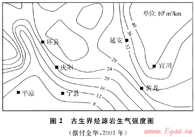 鄂爾多斯盆地上古生界烴源巖生烴模擬計(jì)算[11],成熟烴源巖(Ro>1.25%,達(dá)到生烴高峰)面積達(dá)18×104km2,在盆地內(nèi)廣泛分布。盆地南部煤系氣源巖的生氣強(qiáng)度為(5~40)×108m3/km2(圖2),其中,環(huán)縣-慶陽(yáng)-黃龍一線北東方向生氣強(qiáng)度都超過(guò)20×108m3/km2。