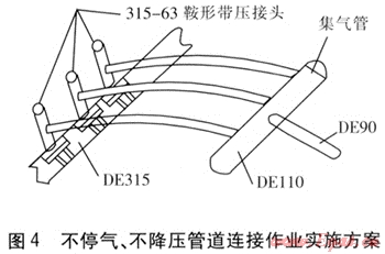 我們在津南開發(fā)區(qū)(東區(qū))建龍分子篩天然氣工程中進(jìn)行該方法的實施作業(yè)。該工程新建DE90燃?xì)夤艿琅c已運行DE315燃?xì)夤艿肋B接,由于園區(qū)內(nèi)無法實施停氣降壓作業(yè),經(jīng)研究采用了鞍形帶壓接頭并聯(lián)方案。不停氣、不降壓管道連接作業(yè)實施方案見圖4。管道連接作業(yè)完成后,經(jīng)對用戶實際用氣設(shè)備燃?xì)饬髁?、壓力檢測,完全符合設(shè)計要求。此管道連接作業(yè)方法現(xiàn)已在我公司推廣使用,大大減少了氣量損失,加快了管道連接作業(yè)進(jìn)度。但也存在不足之處,如DN 150mm以上管道若實施此方案,所需鞍形帶壓接頭數(shù)量過多,與集氣管連接受環(huán)境限制較大,因此在大管徑應(yīng)用上具有局限性。