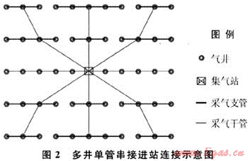 此種串接方式優(yōu)化了管網(wǎng)布置,縮短了采氣管線長度,增加了集氣站轄井數(shù)量,降低了管網(wǎng)投資,減少了對生態(tài)環(huán)境的破壞,適應(yīng)低壓、低產(chǎn)的煤層氣田大規(guī)模開發(fā)。