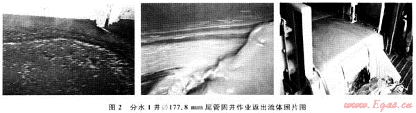 該技術(shù)已在川渝地區(qū)“三高”氣田多口超深井尾管固井作業(yè)中得到了成功應(yīng)用,以分水1井為例(2008年中石油陸上第一口超深井,井深為7353.84m),該井Ø177.8mm尾管固井采用前后隔離液防污染技術(shù),先注20m3前隔離液,中心管附近注6m3后隔離液,有效隔離了鉆井液和水泥漿,防止頂替過(guò)程和拔中心管后水泥漿和鉆井液直接接觸引發(fā)井下復(fù)雜。施工時(shí)間為4.5h,泵注水泥漿和頂替過(guò)程以及拔中心管后大排量循環(huán)鉆井液期間,泵壓平穩(wěn)。碰壓為19MPa,碰壓后起鉆5柱未遇阻,鉆具懸重與稱重時(shí)基本一致,后以1.8m3/min大排量正循環(huán),鉆井液、隔離液以及水泥漿返出界面清晰,相互之間無(wú)較嚴(yán)重污染現(xiàn)象,3種流體及摻混段流動(dòng)性均很好,充分說(shuō)明隔離液與水泥漿化學(xué)兼容性良好。井口返出流體照片從左至右分別是鉆井液、隔離液和水泥漿(見圖2)。