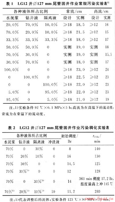 3) 必須開展隔離液與水泥漿的污染稠化實(shí)驗(yàn),保證隔離液對(duì)水泥漿的稠化時(shí)間無(wú)不良影響,避免固井工程事故的發(fā)生。