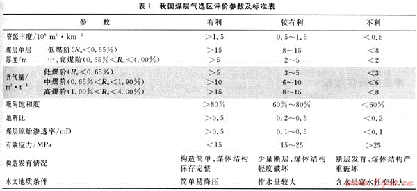 根據(jù)以上研究及評(píng)價(jià),得出我國(guó)煤層氣選區(qū)評(píng)價(jià)參數(shù)及標(biāo)準(zhǔn)(表1)。