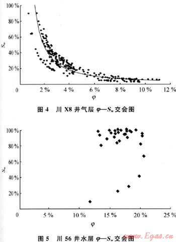 根據(jù)阿爾奇的經(jīng)典公式可以知道:如果儲(chǔ)層只含束縛水,在φ-Sw交會(huì)圖中的交會(huì)點(diǎn)呈近雙曲線分布規(guī)律,說明儲(chǔ)層只含束縛水,不含可動(dòng)水,儲(chǔ)層為氣層(圖4);如交會(huì)點(diǎn)不呈近雙曲線分布規(guī)律,說明儲(chǔ)層不僅含束縛水,還含可動(dòng)水,儲(chǔ)層為水層或氣水同層(圖5)。