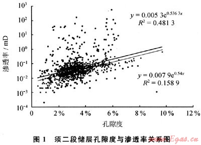 由須二段儲(chǔ)層孔隙度與滲透率的關(guān)系圖(圖1)可見,隨著孔隙度的增大滲透率有變好的趨勢(shì),但孔滲相關(guān)性較差,這說明須二段儲(chǔ)層基質(zhì)孔滲相關(guān)性較好,同時(shí)儲(chǔ)層存在一些與孔隙空間關(guān)系較小的額外滲濾通道,這些滲濾通道使得須二段滲透率值的增加對(duì)孔隙度增加的依賴很小。由薄片鑒定可推斷新場(chǎng)須二段儲(chǔ)層的額外滲濾通道為裂縫(圖2)。工業(yè)氣流的產(chǎn)出對(duì)裂縫的依賴程度很高[1~3]。