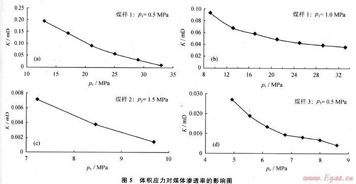 1) 實驗研究了體積應(yīng)力變化情況下煤體的滲流規(guī)律。結(jié)果表明,煤體滲透率隨體積應(yīng)力的增加呈負指數(shù)規(guī)律衰減。