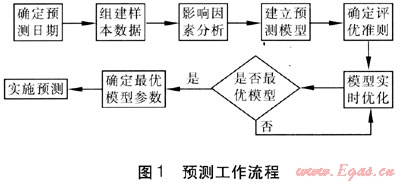 其工作過程如下:分析當(dāng)前需要預(yù)測日期前幾天負(fù)荷及歷史同期負(fù)荷變化情況,實時分析近期主要影響因素,作為模型輸入變量。對建模樣本數(shù)、是否考慮星期及節(jié)假日影響、模型主要變量數(shù)及模型結(jié)構(gòu)參數(shù)等尋優(yōu)。相當(dāng)于建立廠一系列不同的模型,根據(jù)歷史預(yù)測結(jié)果與實際結(jié)果的誤差大小確定評優(yōu)準(zhǔn)則及相應(yīng)的權(quán)值,由式(3)計算得出誤差平方和最小時對應(yīng)的預(yù)測模型參數(shù),再以評估確定的最佳模型進(jìn)行預(yù)測。當(dāng)預(yù)測結(jié)果的真值出現(xiàn)后,進(jìn)一步對預(yù)測結(jié)果進(jìn)行后評價及誤差統(tǒng)計,為下一步預(yù)測時確定或修正評優(yōu)準(zhǔn)則提供依據(jù)。預(yù)測工作流程見圖1。