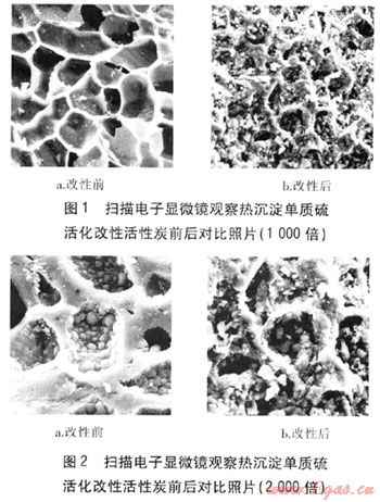 對(duì)活性炭吸附能力起支配作用的是微孔的比例,經(jīng)過熱沉淀單質(zhì)硫活化改性后的活性炭比表面積增加,在表面以及內(nèi)部沉積硫顆粒,對(duì)汞的吸附能力大為增強(qiáng),而且硫與汞化學(xué)結(jié)合后能防止汞的再逸出。掃描電子顯微鏡觀察熱沉淀單質(zhì)硫活化改性活性炭前后對(duì)比照片(1000、2000倍)見圖1、2。由圖1可知,改性后的活性炭微孔比例顯著增加,由此活性炭的比表面積也增大,從而吸附能力也大幅增強(qiáng)。由圖2(與圖1為同一區(qū)域)可知,在改性后的活性炭微孔結(jié)構(gòu)中,大量沉積的硫與活性炭化合,形成親單質(zhì)汞的化合物,由此極大地提高活性炭對(duì)單質(zhì)汞的脫除能力。由Nucon公司生產(chǎn)的經(jīng)過熱沉淀單質(zhì)硫活化改性的活性炭的脫汞效率可提高70%以上。經(jīng)過碘化改性的活性炭,在同樣條件下,吸附脫汞能力是未經(jīng)改性活性炭的160倍[18],可以極大地減少活性炭用量。