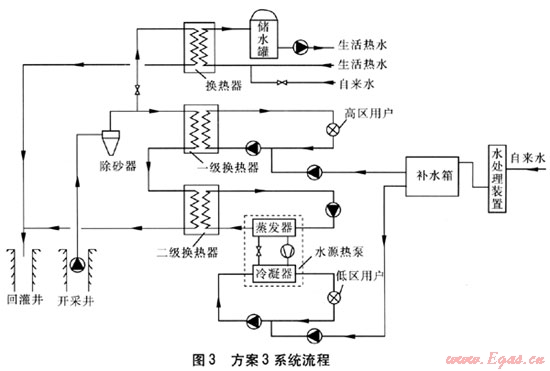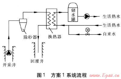 天津市南開區(qū)某住宅小區(qū)擬建兩座高層公寓,規(guī)劃建筑面積約11×104m2。在該小區(qū)內(nèi),現(xiàn)有兩眼奧陶系地?zé)峋W畛?,開發(fā)商只要求利用地?zé)豳Y源解決小區(qū)生活熱水供應(yīng)。設(shè)計單位考慮到節(jié)能、環(huán)保,為開發(fā)商提供了3種地?zé)豳Y源利用方案,希望地?zé)豳Y源能夠得到充分合理的利用。