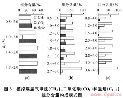 模型表明了演化階段不同則各種煤層氣組分含量的變化情況。煤層氣組分組成與煤的演化階段、成熟度和保存情況密切相關(guān)。成煤有機(jī)質(zhì)分別最終演化到Ro最大為2.O%、3.0%和4.O%時(shí)煤層氣的組分構(gòu)成不同。例如,當(dāng)Ro=1.0%演化到Ro=2.O%時(shí),煤層氣組成中CH4的含量為45%,CO2為9%,重?zé)N46%;Ro=1.0%演化到Ro=3.0%時(shí),CH4含量為52%,CO2為24%,重?zé)N23%;Ro=1.0%演化到Ro=4.0%時(shí),CH4含量為66%,CO2為29%,重?zé)N5%。由此可見,有機(jī)質(zhì)熱成熟演化過(guò)程越長(zhǎng),煤層氣組分中烴類氣體CH4含量越高,重?zé)N氣體的含量越低。這一規(guī)律與實(shí)際的地質(zhì)環(huán)境中,煤巖演化程度愈高,煤層甲烷的含量越高,重?zé)N含量愈低的情況相符的。而C02基本保持了隨成熟度演化過(guò)程增長(zhǎng)而含量增大的趨勢(shì)。所以,在應(yīng)用煤層氣組分進(jìn)行煤層氣分類時(shí)要考慮這些因素的影響。