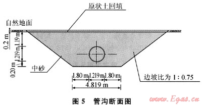 西氣東輸二線輸氣管道罐罐嶺地震斷裂帶施工段采用寬管溝敷設(shè)方式,對于地震斷裂帶兩側(cè)各30m范圍內(nèi),以斷裂帶為中心,逆氣流方向一側(cè)溝底寬4.819m,管溝挖深4.609m,管溝放坡為1:0.75,管溝底部2.0m深度部分用中砂墊層。順氣流方向一側(cè)溝底寬4.819 m,管溝挖深2.809m,管溝放坡為1:0.75,管溝底部0.2m深度部分用中砂墊層,如圖1、2所示。