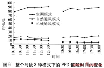 整個時段3種模式下的PPD值隨時間的變化見圖6。由圖6可知,自然通風(fēng)模式下PPD值在下午時段達(dá)到20.3%;機(jī)械通風(fēng)模式下除個別時刻外,大部分時間PPD值都在10%以下;空調(diào)模式下的PPD值高達(dá)80%以上。由此說明,在重慶地區(qū)過渡季節(jié)開啟空調(diào)并沒有給室內(nèi)創(chuàng)造令人滿意的熱環(huán)境。