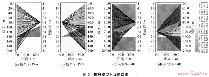 圖3為兩個(gè)楔形模型的射線追蹤圖,比較可以發(fā)現(xiàn),對(duì)于尖滅傾斜層來說,激發(fā)井相對(duì)地層為下傾或接收井相對(duì)地層為上傾時(shí)(圖3-b、圖3-d),其經(jīng)過尖滅傾斜層射線明顯多于上傾激發(fā)或上傾接收(圖3-a、圖3-c)。顯而易見,利用下傾激發(fā)上傾接收的井間資料進(jìn)行偏移成像或?qū)游龀上瘢涞玫降慕Y(jié)果肯定優(yōu)于上傾激發(fā)下傾接收的結(jié)果。圖4是與圖3-c、3-d對(duì)應(yīng)的物理模型實(shí)驗(yàn)炮集記錄,也表現(xiàn)出同樣的結(jié)果。數(shù)值模擬和物理模擬結(jié)果均表明下傾激發(fā)、上傾接收得到的井間記錄能更好地反映井間介質(zhì)的變化。