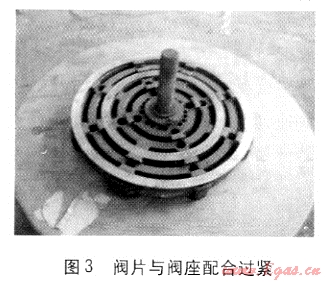 b. 對吸排氣閥進行分組選擇裝配,防止閥片與閥座配合過緊、卡死而加大壓縮機工作阻力。在吸氣閥的組裝過程中,很多操作人員憑借經(jīng)驗和感覺組裝吸氣閥。若壓縮機吸氣閥及運動部件的尺寸公差裝配不當,極易發(fā)生閥片與閥座配合過緊卡死或徑向斷裂的現(xiàn)象。圖3是閥片與閥座配合過緊。