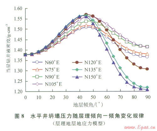 3)在鉆進(jìn)地層傾角為30°~60°之間的頁(yè)巖氣藏水平井時(shí),應(yīng)注意具有較高的坍塌壓力。近水平和近垂直的地層中坍塌壓力有所降低,降低幅度與地層傾向有關(guān),越接近最小地應(yīng)力方向下降幅度越大。